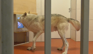 Auch Kenais Rudelmitglied Amarok konnte es nie erwarten, den Testraum betreten zu dürfen. Und so führten Kenai und Amarok beinahe an jedem Testtag eine hitzige Diskussion darüber, wer als erster starten durfte. Doch schien Amarok im Vergleich zu Kenai nicht wirklich daran interessiert gewesen zu sein, die Aufgabe am Touchscreen mit Bravour zu meistern. Vielmehr war der unerschrockene Wolf damit beschäftigt, am Touchscreen zu nagen, wie ein Känguru in die Luft zu springen und zu versuchen, Türen zu öffnen. Eines muss man zugeben… seine Sessions waren… wie soll ich es ausdrücken… sehr abwechslungsreich und abenteuerlich!