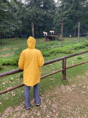 Vor allem wenn etwas passiert, wie z.B. die Fütterung mit einem ganzen Huhn, sieht man wie die Besucher stehen bleiben und einfach zugucken, jede Bewegung beobachten und versuchen dem Moment eine Lehre zu entziehen. Ähnlich wie ich mit meiner Studienkollegin am Wegesrand stehe, und versuche durch das genaue Beobachten diese Tiere, die uns so nah und doch so fern erscheinen, besser zu verstehen. Nah, weil sie direkt vor uns sind und in so vielen Facetten des Menschens besten Freund gleichen (im Sommerfell so sehr, dass viele Besucher sich verwundert fragen, ob sie gerade einen Wolf oder einen Hund sehen). Und so fern, weil wir in Europa ohne den Wolf aufwachsen und unser Wissen meist aus schaurigen Märchen stammt.