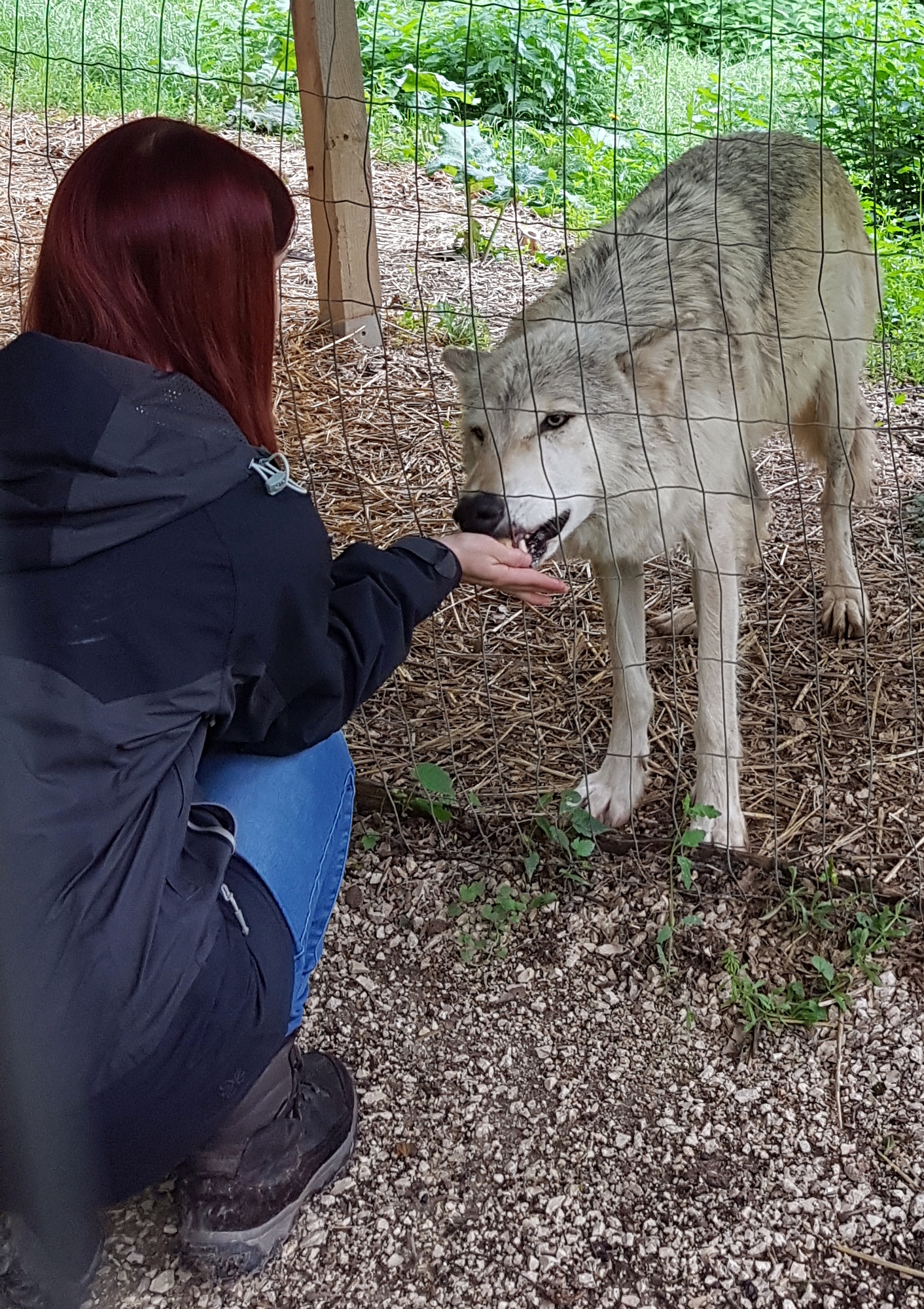 So mancher Wolf am WSC gibt sich mit keiner Wurst zufrieden oder lässt sich mit dieser nichts vormachen. So kam es beispielsweise schon vor, dass die Wurst oder auch ein Stück Fleisch, in welches eine Tablette eingerollt werden kann, so lange geschüttelt wurden, bis die Tablette zu Boden fiel und Wurst oder Fleisch ohne Medikament verschlungen werden konnten. In diesem Fall bekommt der Wolf eine „Extrawurst“: Ein begehrtes Küken! Aus der Kühlkammer herausgeholt und aufgetaut, reißt man dem auserwählten Küken seinen Kopf ab. Den Schnabel aufgemacht, schiebt man ihm die Tablette in den Rachen, bevor man den Schnabel wieder schließt, um die Tablette sicher darin zu verpacken. Im Vergleich zu Nanuk ist seine Partnerin Una etwas scheuer und benötigt hin und wieder etwas Zeit und Überzeugungskraft, bis sie kommt und den Kükenkopf frisst. Und so beginnt man hochmotiviert und mit hoher Stimme zu rufen: „Uuuniii!“ oder auch: „Unibuni!“ (ihr Spitzname, der sich sogar schon in den Kalender der Mitarbeiter schlich). Kommt sie schließlich, frisst den Kükenkopf sogar noch aus der Hand und schenkt dir etwas von ihrem Vertrauen, so geht ein weiterer wundervoller Tag am WSC zu Ende!