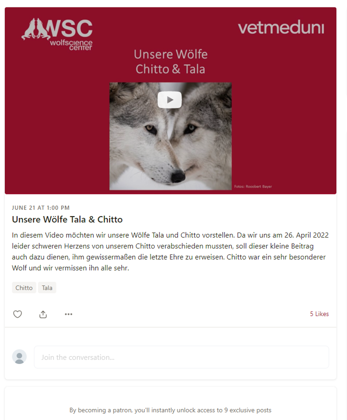 Ein weiteres Projekt, das wir gestartet haben und das für uns völlig neu ist, ist die Eröffnung unseres eigenen Patreon-Profils (www.patreon.com/wolfsciencecenter). Schon lange wollten wir unsere Arbeit sowohl mit Menschen teilen, die weiter von uns entfernt wohnen, als auch unseren treuen Besuchern die Möglichkeit bieten, die Entwicklung unseres Teams regelmäßig zu verfolgen. Patreon ermöglicht es uns, Videos unserer Arbeit und unserer Beziehung zu unseren Tieren mit Allen zu teilen, die daran interessiert sind, sie zu sehen. Wir bieten derzeit zwei Mitgliedschaftsstufen an: Level “Sammler”: wo wir jeden Monat ein Video mit unseren Patrons teilen und Level “Jäger”, wo unsere Patrons zusätzlich zu den Videos zweimal im Jahr an einem Online-Seminar teilnehmen können. In den Videos und den Seminaren zeigen und diskutieren wir verschiedene Themen unserer Arbeit, von der Vorstellung unserer Tiere bis hin zur Diskussion unserer Trainingstechniken.