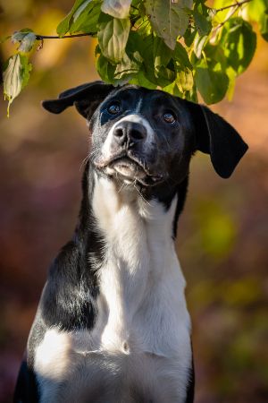 Taio ist ein hübscher, schwarz-weißer gefleckter Hund mit einer markanten Blesse rund um die Schnauze, die bis zwischen die Augen reicht. Er hat Schlappohren und einige Denkerfalten auf der Stirn, die ihn etwas philosophisch erscheinen lassen. Daher kommt sein Spitzname „Der Professor“.