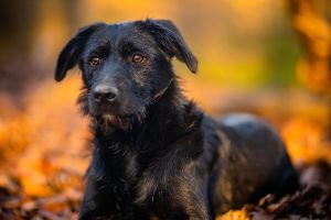 Youma ist eine pechschwarze, eher zierliche Hündin, mit einem einzelnen weißen Abzeichen unter dem Kinn. Ihre Augen sind eben so dunkel wie ihre Haarpracht, was sie zu einer besonderen Herausforderung für jeden Fotografen macht. Youmas Fell ist noch sehr weich und überwiegend kurz, aber es lassen sich, insbesondere an der Schnauze, schon Ansätze von einzelnen längeren Haaren erkennen, sodass wir davon ausgehen, dass sie als erwachsene Hündin vermutlich in die rauhaarige Richtung tendieren wird (so wie ihre Mutter). Youmas Milchzähne sind blendend weiß und spitz wie kleine Dolche.