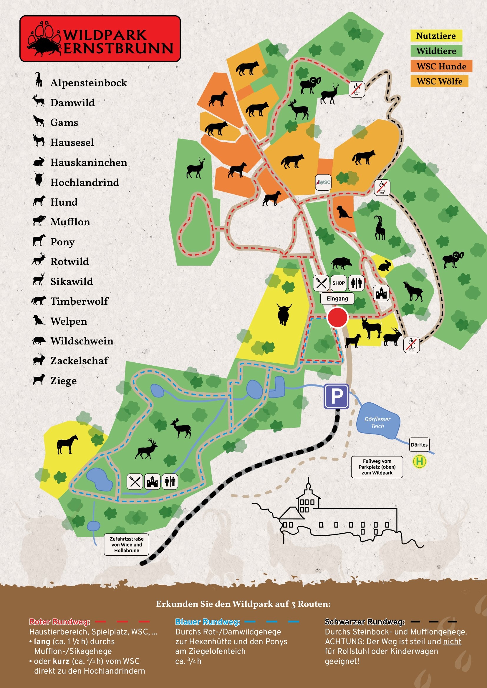 Das Wolfsforschungszentrum befindet sich im Wildpark Ernstbrunn. Hier findet man neben unseren Einrichtungen verschiedene Nutz- und Haustierrassen, spannende Wege durch den Wald und tolle Veranstaltungen. Nur 40 km von Wien entfernt, ist er ein Ausflugsziel für die ganze Familie. Hunde an der Leine sind ebenfalls herzlich willkommen!